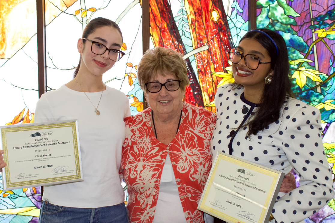 Abrescy-Kranich Research Award Reception (2025) recognizes Manesh and Muñoz April 7, 2025 The Library hosted a reception for the 2024-2025 Abrescy-Kranich Library Research Award on Friday, March 21 to recognize the accomplishments of undergraduate awardees Maya Manesh and Diana Muñoz. This years’ winner were Diana Muñoz, a second-year Computer Science and Engineering major, and Maya Manesh, who will graduate spring 2025 with a Bachelor of Science degree in Cognitive Science and a Bachelor of Arts degree in Sociology. |