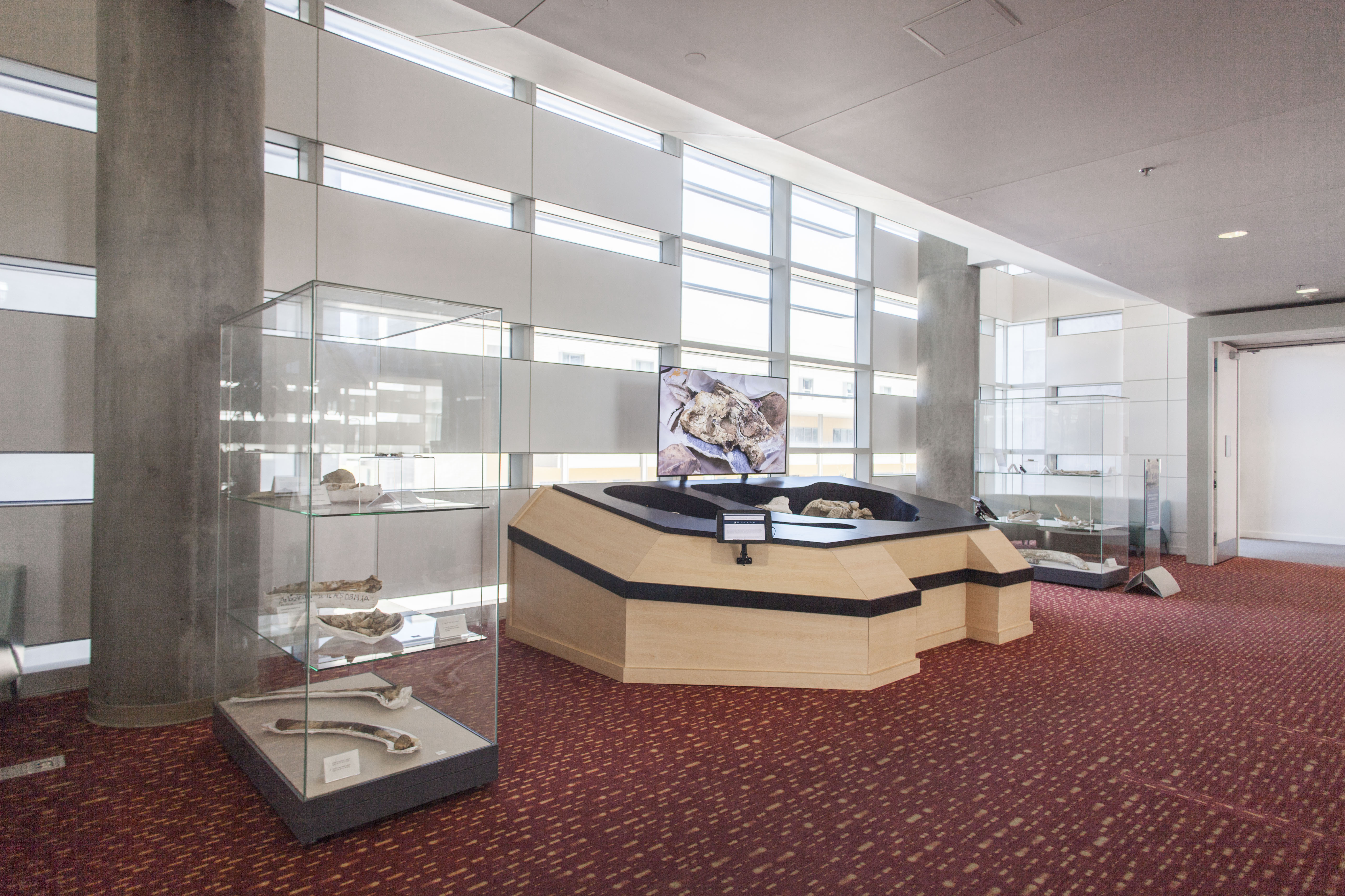 Library Debuts New Exhibit, Columbian Mammoth Bones Author: Breanna Wright April 17, 2017 In 2012, Columbian mammoth bones and more than 1,500 other fossils from the Pleistocene epoch were discovered by Caltrans workers in Merced County. Under the direction of Professor Mark Aldenderfer, the former dean of the School of Social Sciences, Humanities and Arts, UC Merced accepted the fossils, which are now part of a permanent display to ensure they remained local and accessible to researchers and the public. The exhibit, on the second floor of the UC Merced Library near the services desk, features a juvenile mammoth skull and the skull, femur and tusk of a mammoth estimated to be 49 years old at the time of death. |