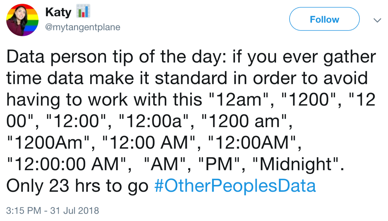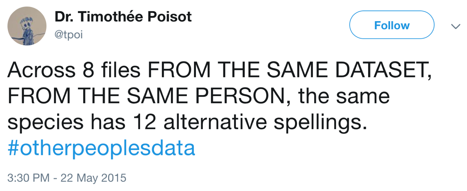 For frustrating examples of poor metadata standards (or no standards), try searching Twitter for "#otherpeoplesdata." Figures __ and __ are two examples.