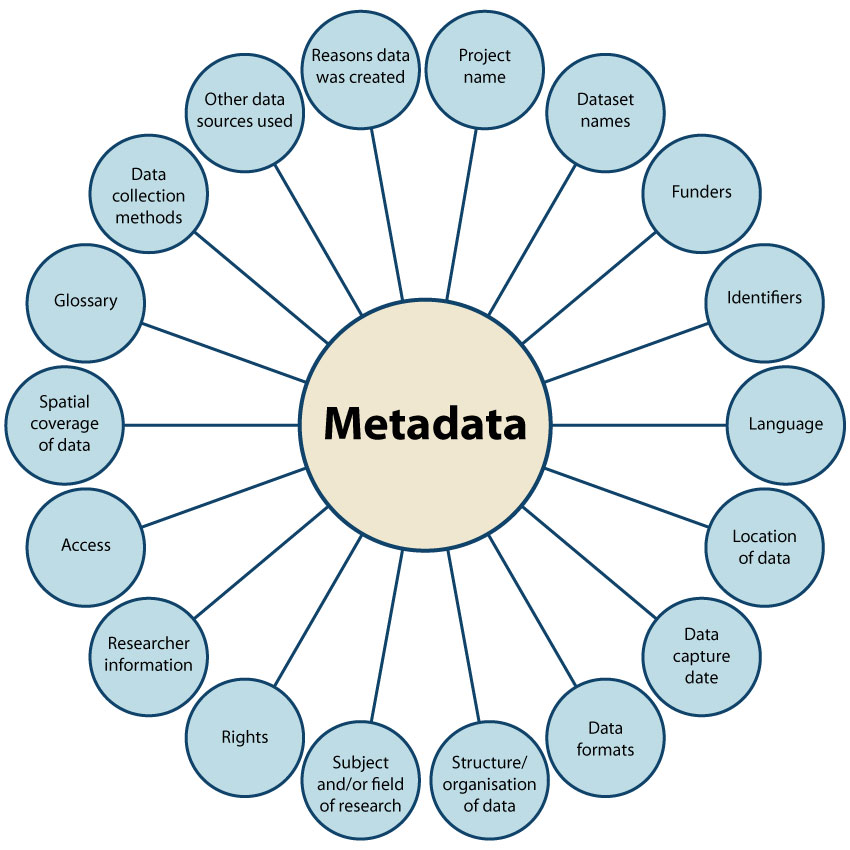 Figure __ shows some of the many possible categories of information that metadata can encompass. Individual choices can vary from project to project; the key is to ensure that enough information is provided to create context for the data.