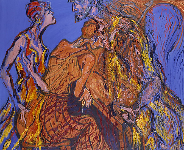 The very nature of power and control becomes a vehicle for layered images of narrative in “Judgment of Paris,” “Gertrude,” and “Lear.” Choices are made, judgments are imposed, and social norms and laws are broken for the sake of individual will. These paintings are dark and murky with progressive states which obscure and obliterate initial action. The mythic is repeated from one generation to the next, from one century to the next, from one culture to the next. The drive to power and rule appears governed by impulses common across borders, spanning millennia.