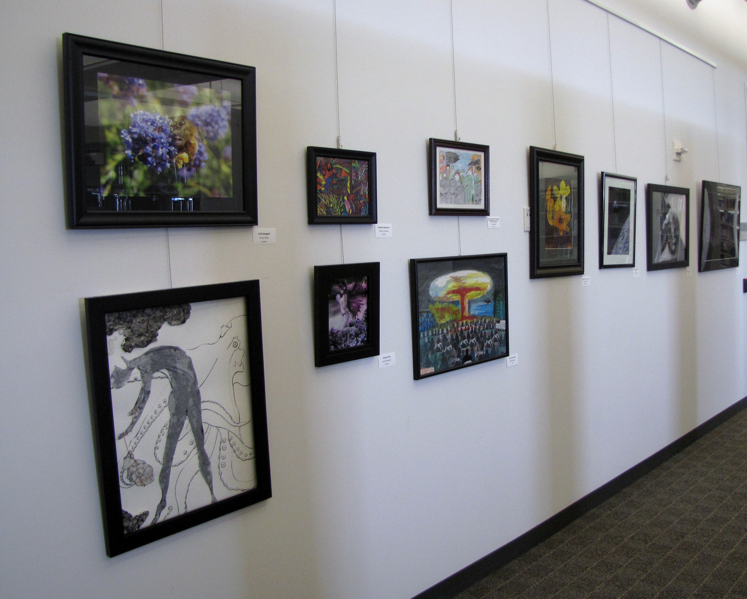 It’s that time of year when the entire campus and its family members are invited to share their creative talents. This year’s exhibit features art throughout every floor of the library, and the variety of submissions includes life-size sculpture, mixed media, traditional painting and drawing, along with digital submissions that can be viewed via the first floor elevator lobby or third floor video wall.