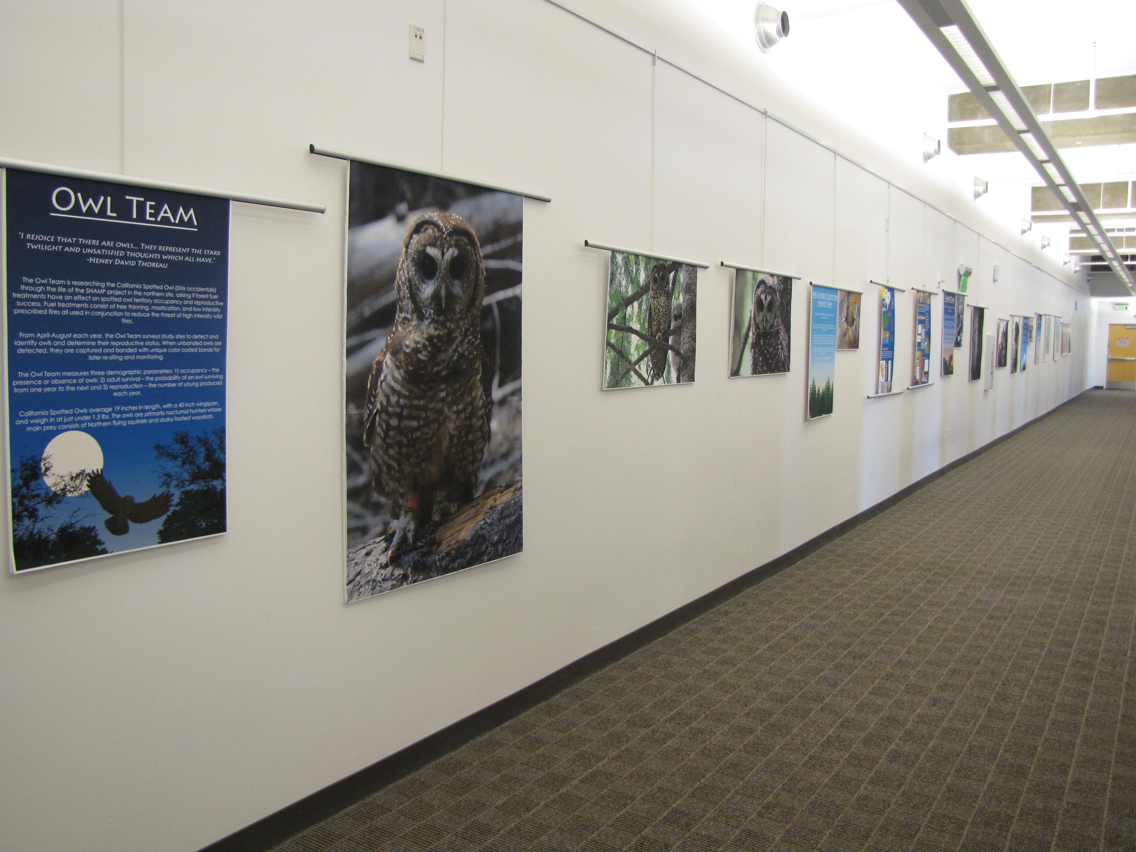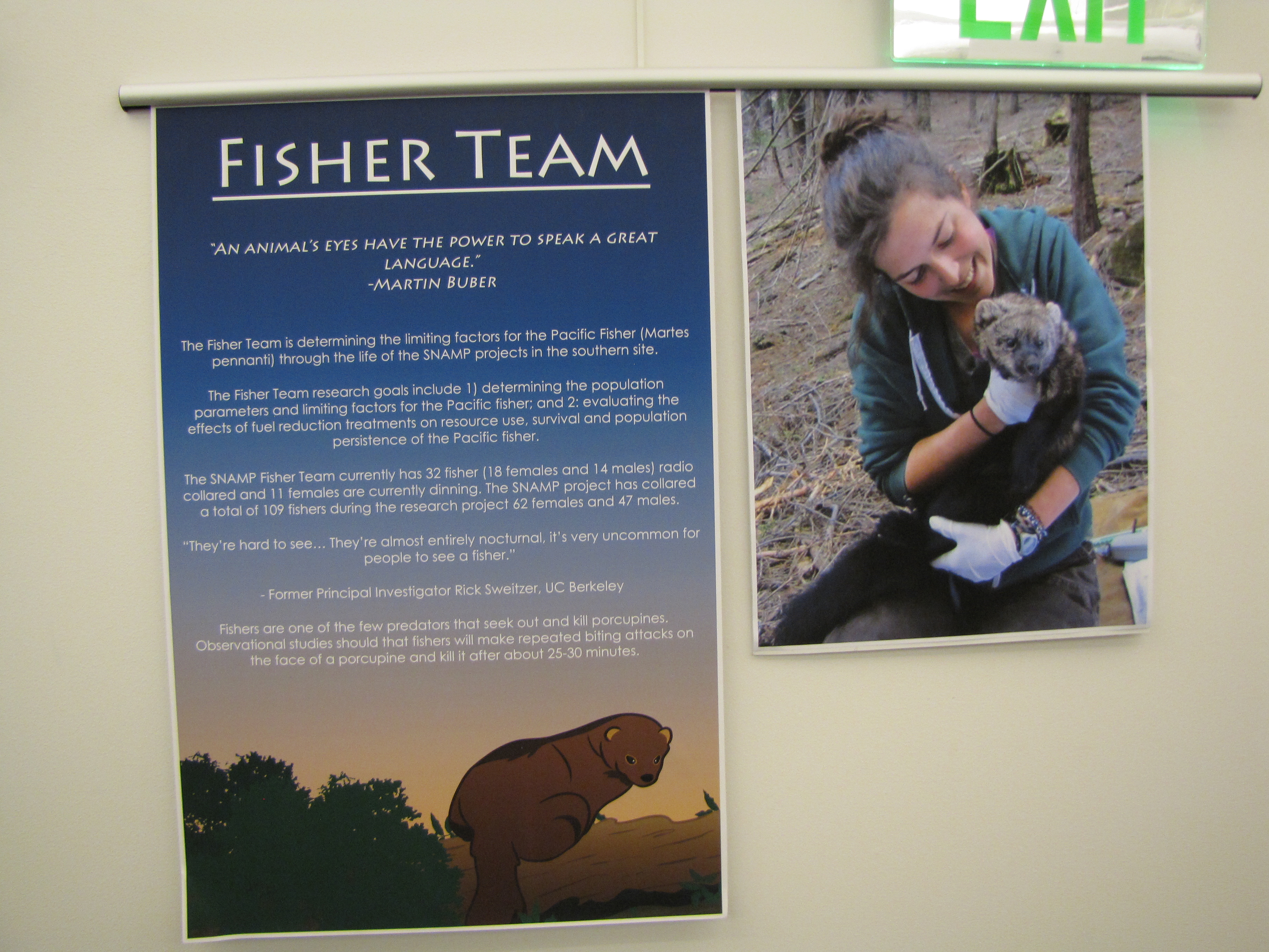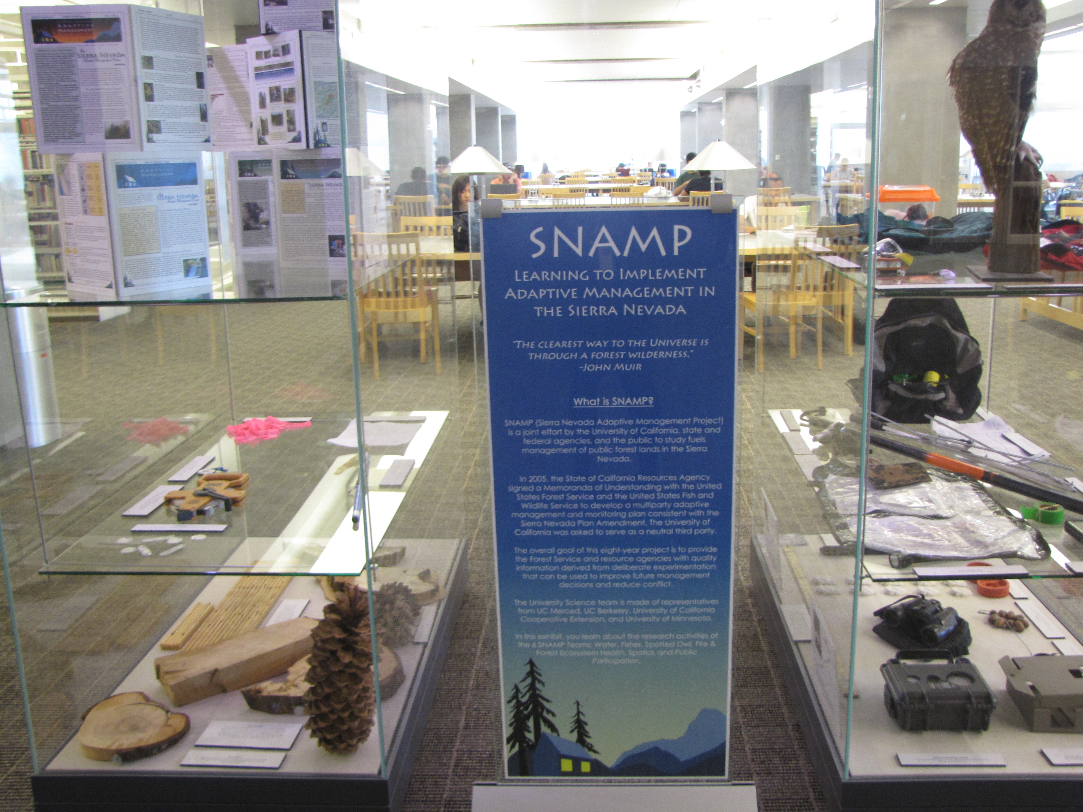 In this exhibit, you will learn about the research activities of the 6 SNAMP Teams: Water, Fisher, Spotted Owl, Fire & Forest Ecosystem Health, Spatial, and Public Participation. Through a series of posters, photographs and videos (playing on select digital signage monitors throughout the library), plus scientific equipment, tools, and specimens, you’ll get a chance to experience what it truly means to study forest management.
